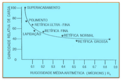 Influência na capacidade relativa de carga: Em estudo feito em mancais de motores de combustão interna observou-se que a rugosidade, tanto do casquilho como do colo da árvore de manivelas, será tanto maior quanto maiores forem as condições de carga. Na figura, podemos observar como varia a capacidade de carga de um casquilho com a rugosidade superficial. A máxima capacidade de carga é obtida com melhoria de 100% com relação à superfície simplesmente retificada.