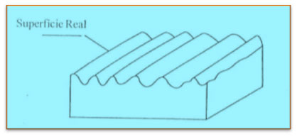 Superfície real: Superfície que limita o corpo e o separa do meio que o envolve. É a superfície deixada pelo método empregado em sua produção, por exemplo, torneamento, retífica, ataque químico, etc. Superfície que podemos ver e tocar.