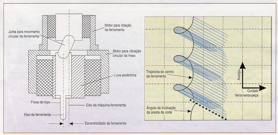 Com a vibração, a ferramenta executa movimento elíptico, afastando-se de forma intermitente da peça. O interstício entre os contatos pastilha-material é suficiente para resfriar a aresta de corte e evitar a reação entre os átomos de carbono em atrito, aumentando a qualidade superficial e a vida da ferramenta.