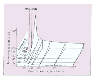 Este problema está relacionado ao fenômeno denominado “recristalização secundária”, que se caracteriza pelo crescimento anormal dos grãos que se encontram junto à superfície da peça ou da ferramenta, aumentando sua temperabilidade e, conseqüentemente, provocando um crescimento localizado destas áreas . A figura 3 apresenta o diagrama do comportamento do tamanho de grão em função do grau de deformação e da temperatura.