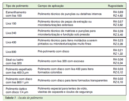 A Tabela 1 apresenta uma relação dos tipos de polimento mais utilizados na indústria com os campos de aplicação relacionados.
