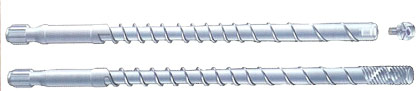 Rosca em formato cônico e com variação do passo, da profundidade dos canais e do ângulo dos filetes para máquinas de injeção(cima).